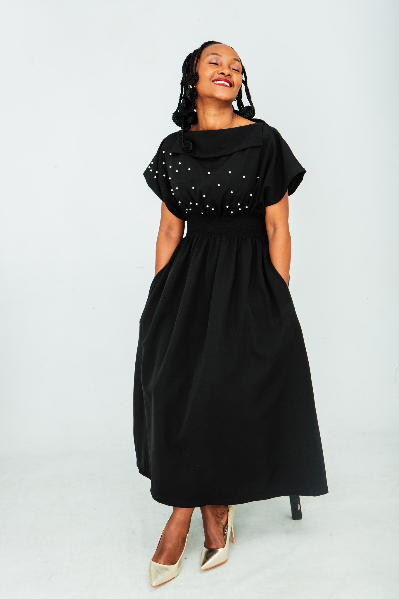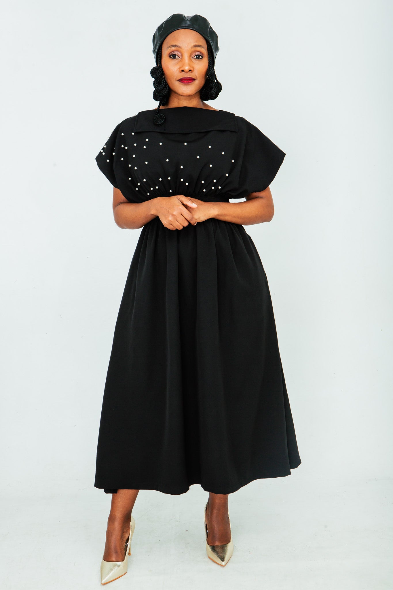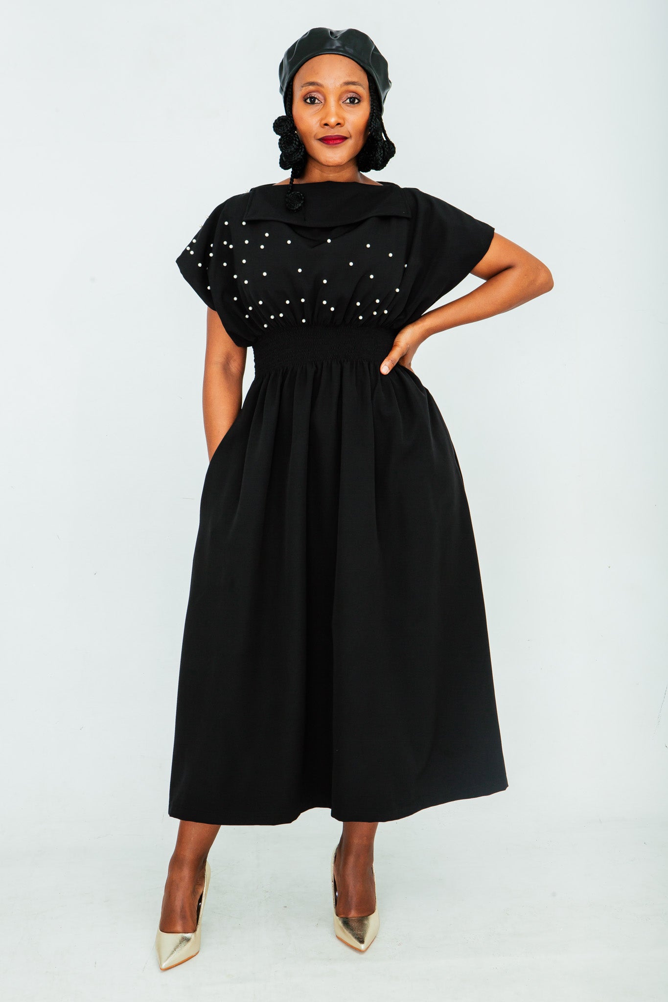 -The silhouette flatters the figure with delicate shirring elastic at the waist, creating a comfortable and cinched fit.